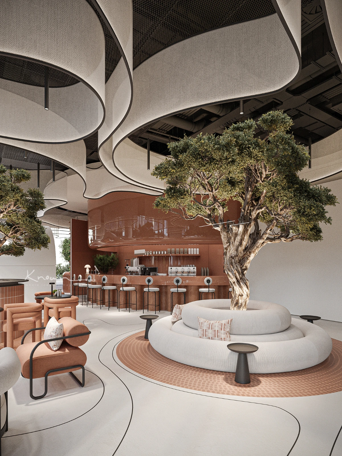 Anchored by mature olive trees and circular seating zones, the layout encourages community and calm. Soft curves, natural textures, and architectural lighting bring a sense of movement and harmony—making this café not just a destination for coffee, but a spatial experience rooted in design, nature, and contemporary Dubai culture.