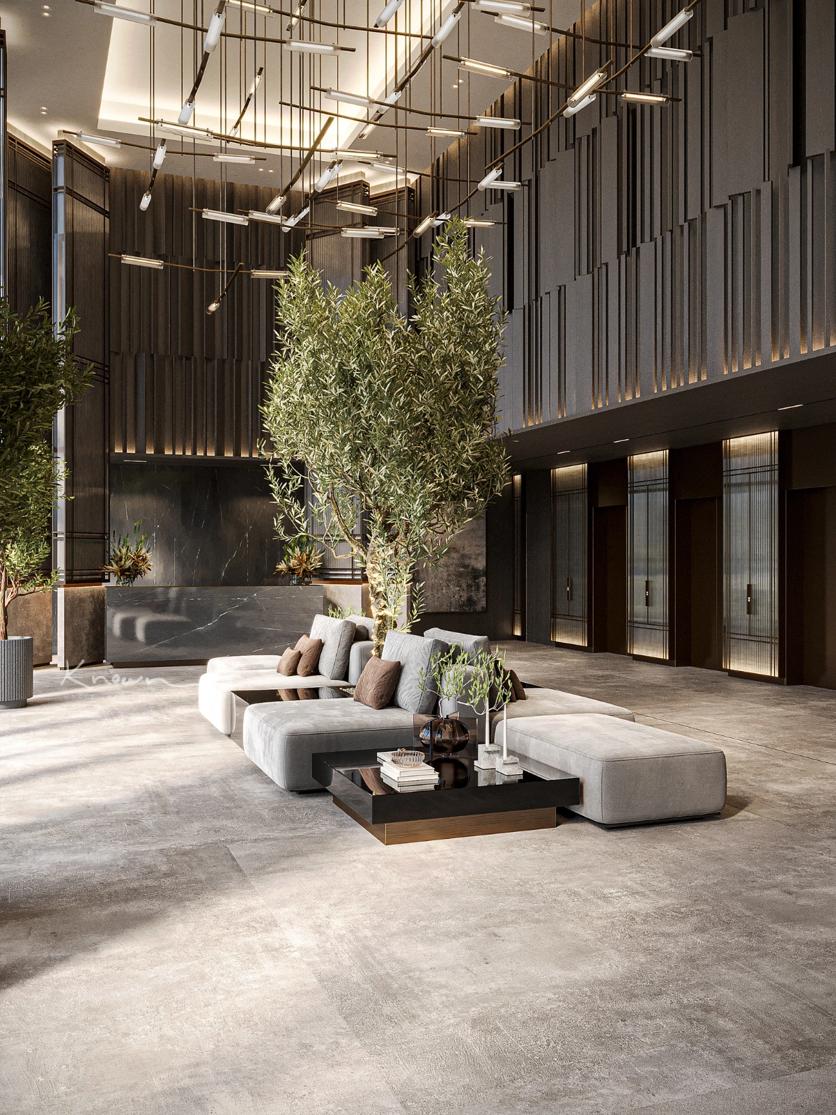 This contemporary lobby lounge reimagines the arrival experience through a bold yet understated composition. Centered around a mature olive tree and sculptural, low-slung seating, the design balances minimalist geometry with organic softness, creating a quiet dialogue between architecture and nature.