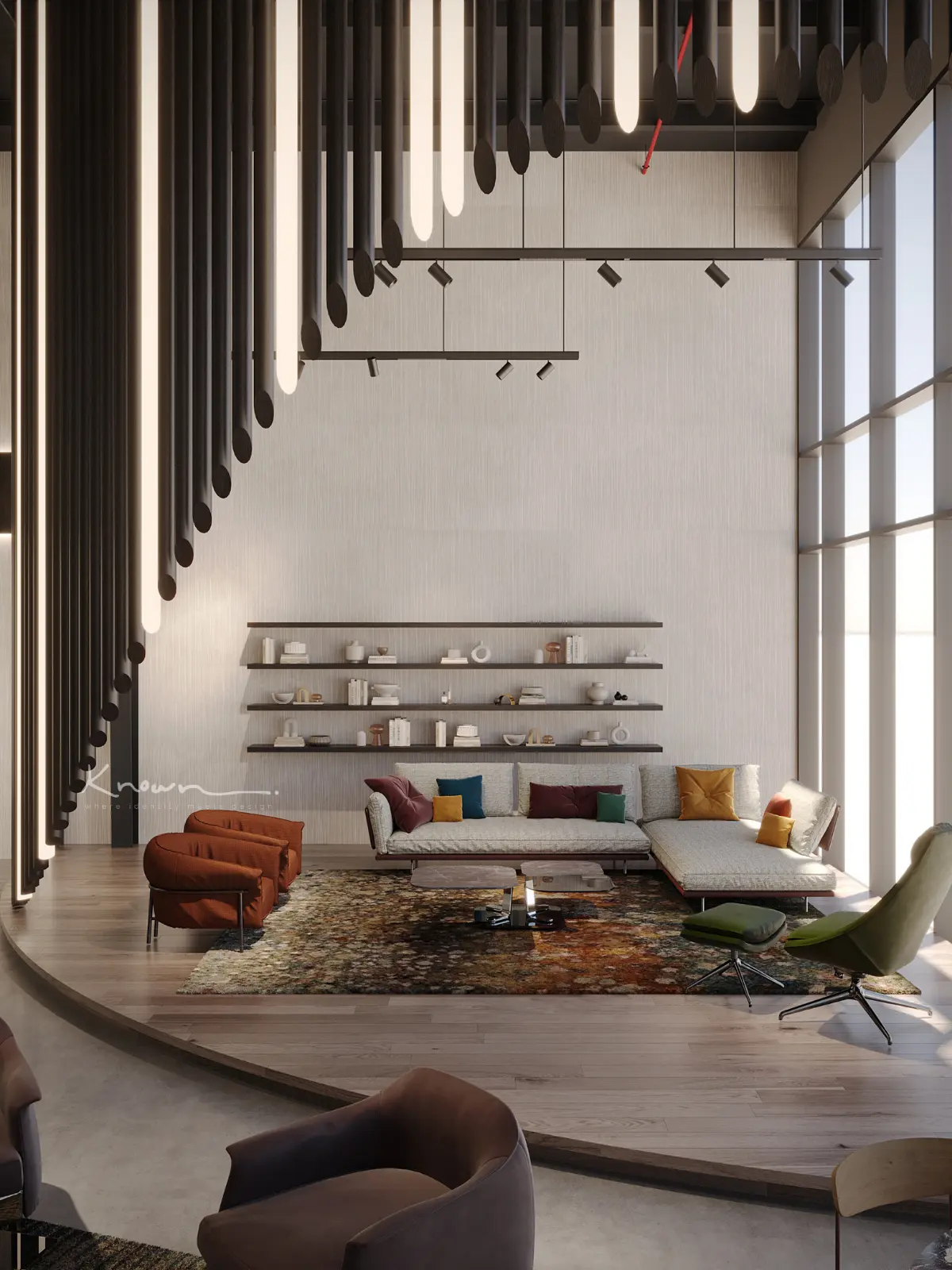 Located on Dubai’s prestigious Sheikh Zayed Road, this Italian luxury furniture showroom offers a curated spatial experience that blurs the line between art, architecture, and interior design. The space is defined by double-height volumes, sculptural lighting, and a lush biophilic ceiling installation that creates a dramatic, gallery-like setting.