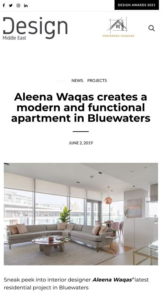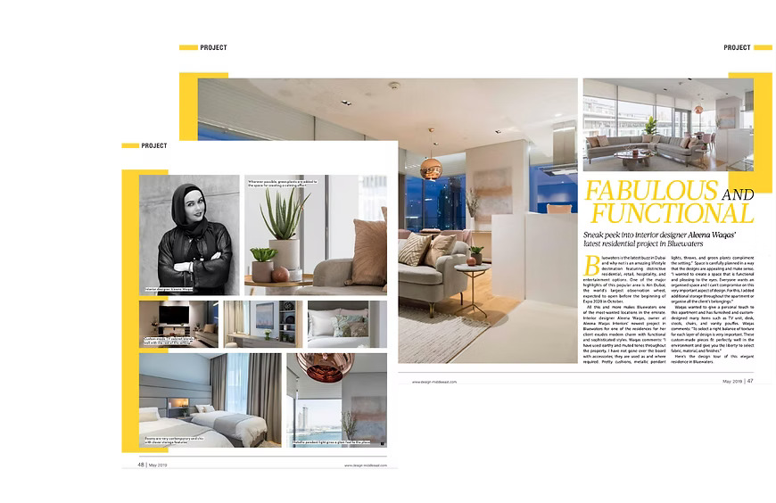 Aleena Waqas creates a modern and functional apartment in Blue waters. Aleena discusses her projects and design process, focusing on her work in one of the most sought-after locations in the Emirates. The piece highlights how she transforms spaces into iconic interiors, setting a new benchmark for affordable luxury in interior design.